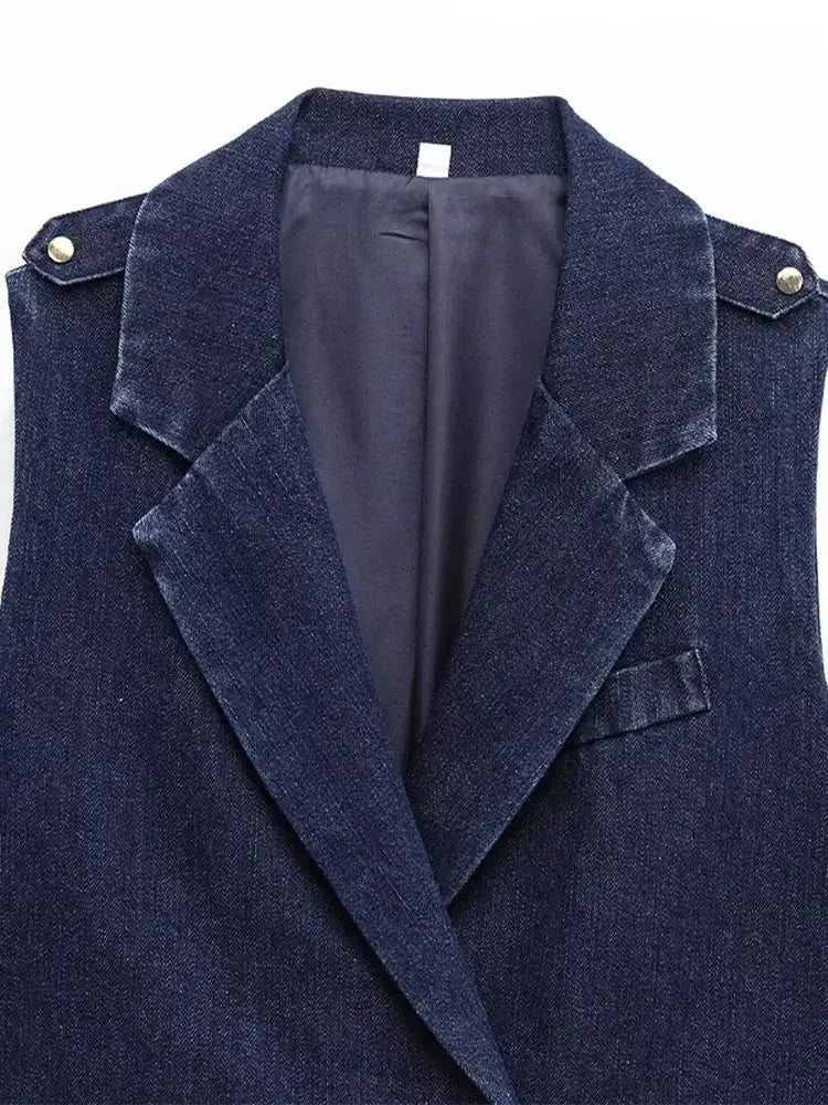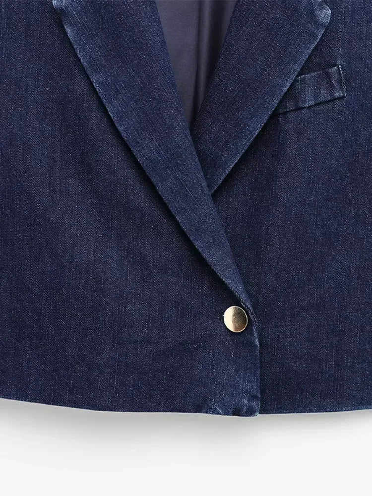 Conjunto Feminino em Denim Azul Escuro – Estilo Retrô & Streetwear Destaque-se com este conjunto feminino 2 em 1 em jeans azul escuro com design retrô e toque moderno. O look combina um colete cropped com lapela e mangas
