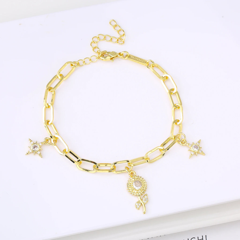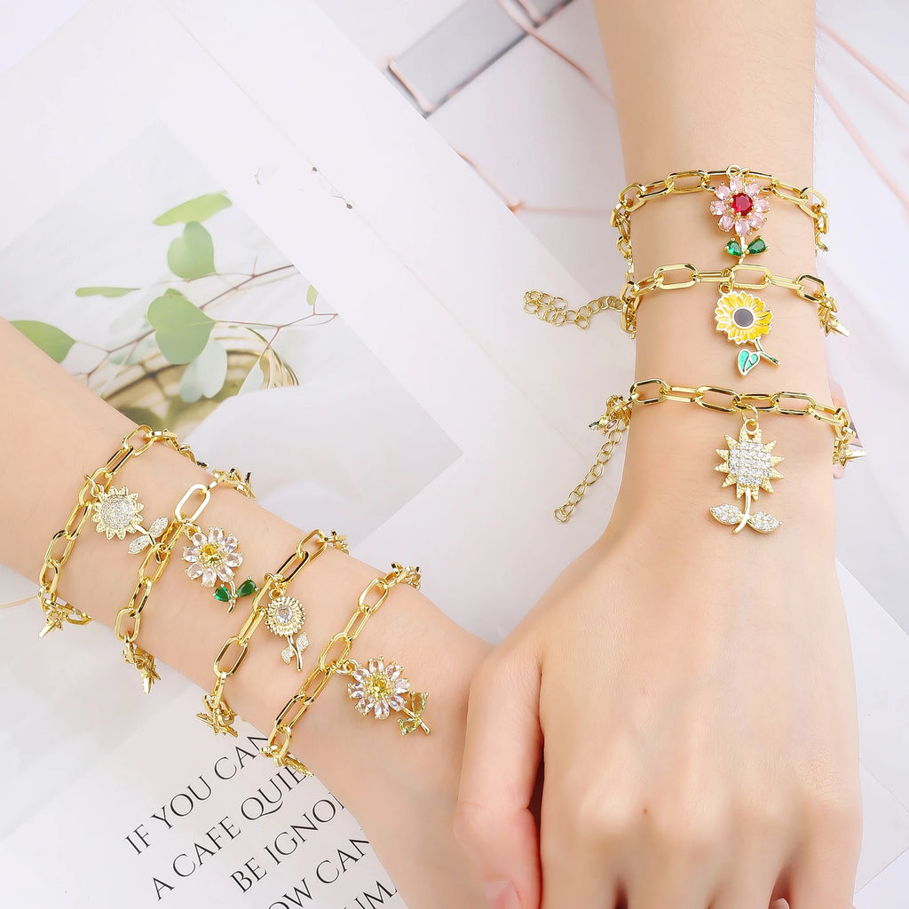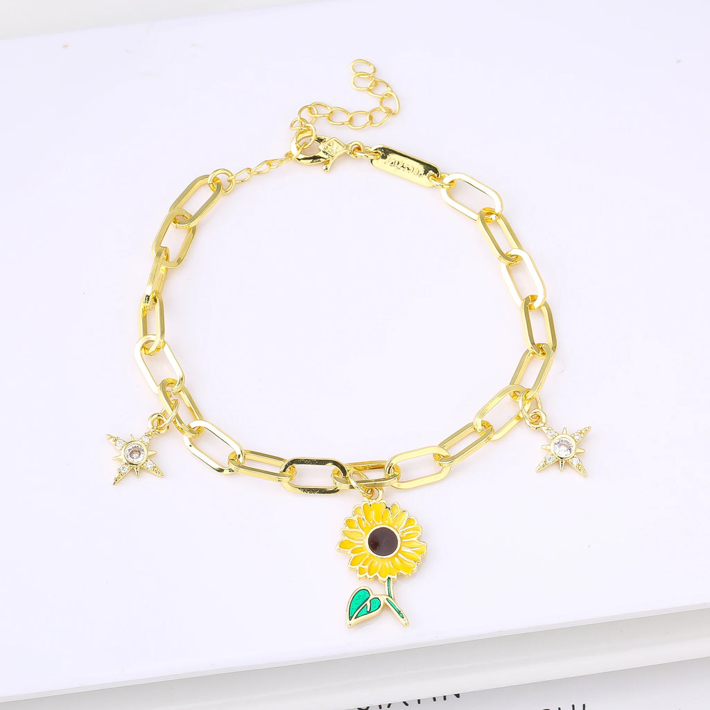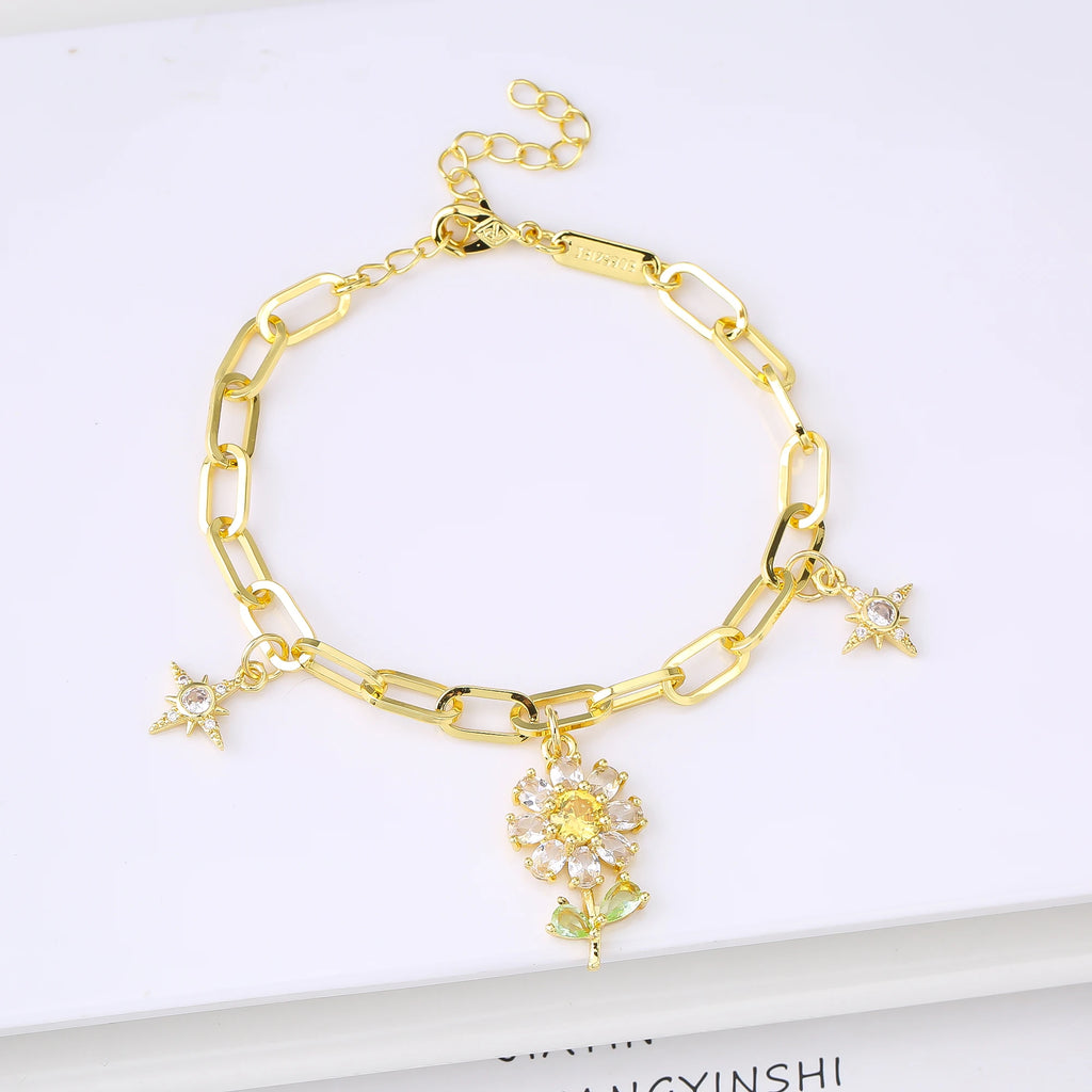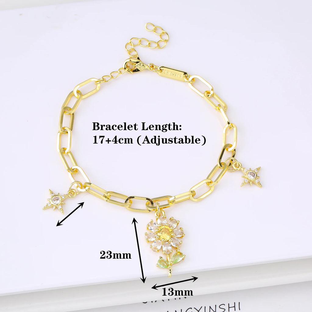 Nome: Pulseira Botânica de Girassol com Cristais, Estrela de Zircónia, Pulseira Ajustável para Mulher — Joia de Luxo para Festa, Amuleto de Sorte, Presente para Rapariga