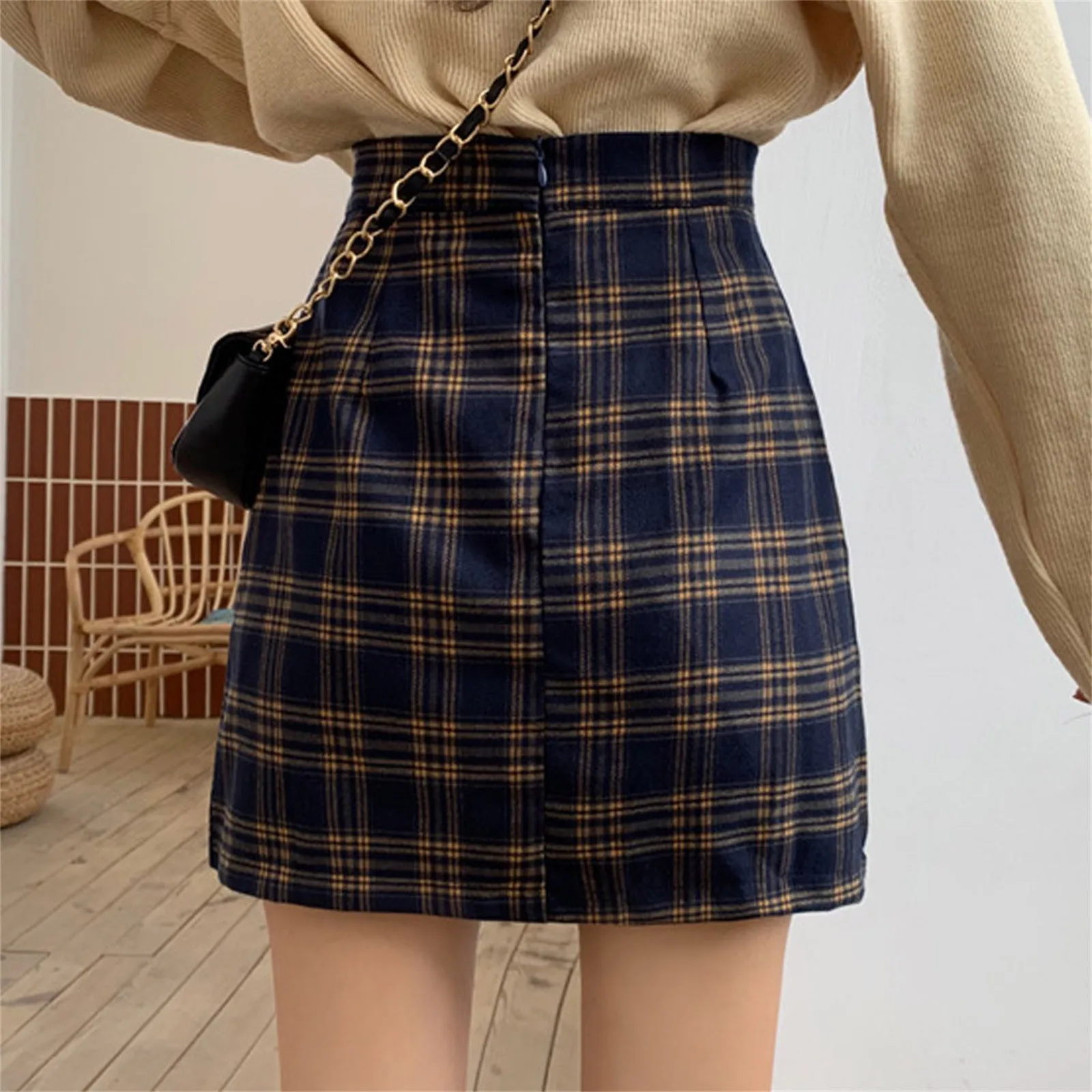 Saia Feminina Estilo Preppy em Estampa Xadrez Retrô – Cintura Alta, Corte em Linha A Destaque-se com elegância e atitude! Esta saia midi combina o charme retrô do xadrez clássico com o toque moderno do estilo preppy. C
